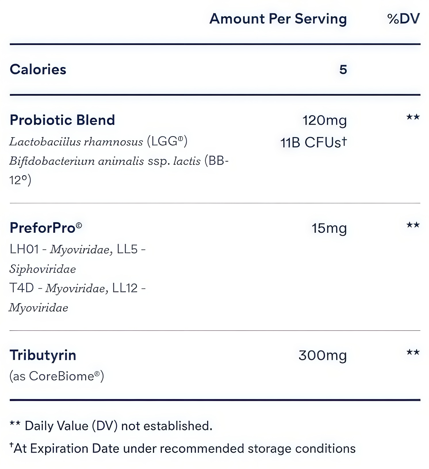 Probiotic strains LGG® & BB-12® support healthy regularity as well as relief of occasional discomforts such as mild and occasional bloating, gas, and diarrhea.
